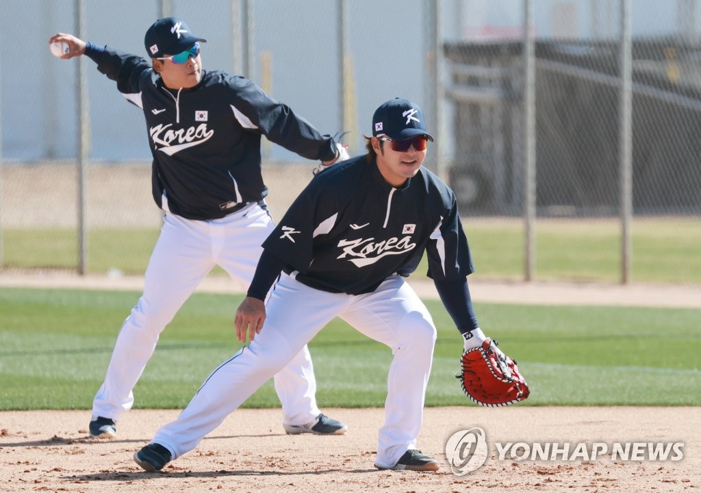 | ▲ South Korean first baseman Park Byung-ho (R) takes part in a fielding drill during a practice session for the World Baseball Classic at Kino Sports Complex in Tucson, Arizona, on Feb. 15, 2023. (Yonhap) |