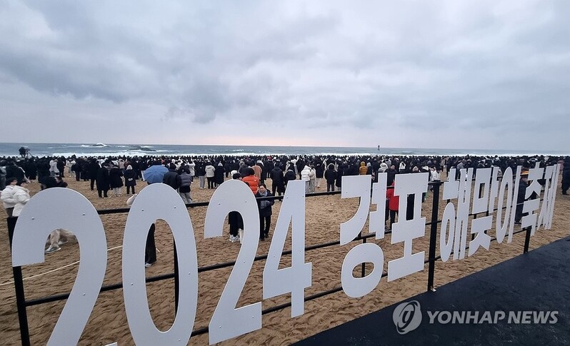 | ▲ 새해 첫날 경포해변의 해맞이 인파 (강릉=연합뉴스) 유형재 기자 = 2024년 첫날 강원 강릉시 경포해변에서 해맞이객들이 일출을 기다리고 있다. 강릉을 비롯한 강원 영동은 이날 해상에서 낮은 구름이 유입돼 해돋이를 볼 수 없었다. 2024.1.1 yoo21@yna.co.kr |