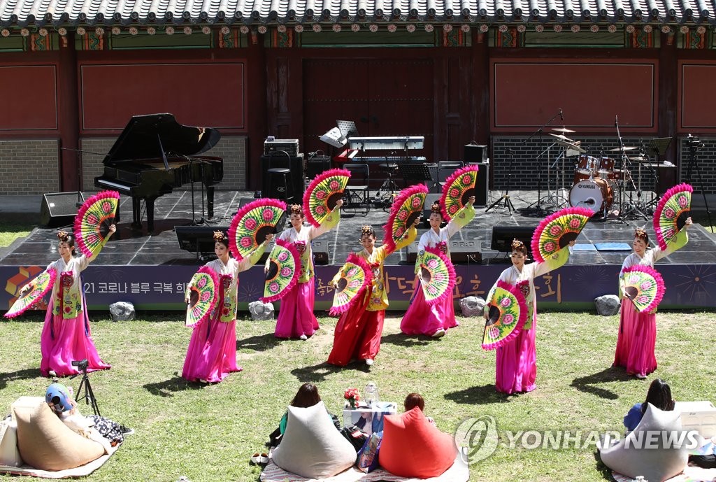 | ▲ People enjoy a Korean fan dance performance at Changdeok Palace in Seoul amid the COVID-19 pandemic on May 9, 2021. (Yonhap) |
