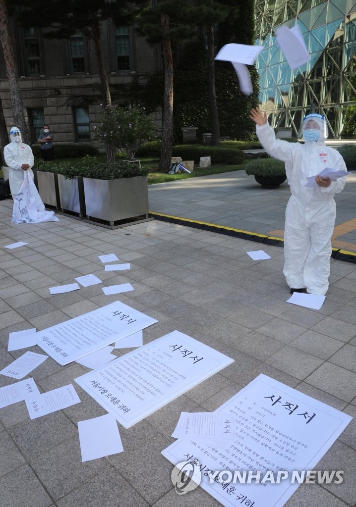 In a show of protest, the nurses prepared and scattered the resignation letters of 674 former nurses who quit their jobs at the Seoul National University Hospital (SNUH), the Boramae Medical Center and the Seoul Medical Center between January 2020 and July due to work overload.