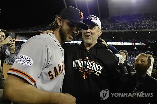 | ▲ 2014년 샌프란시스코에서 월드시리즈 우승 일군 보치 감독과 범가너 [EPA=연합뉴스 자료사진] |