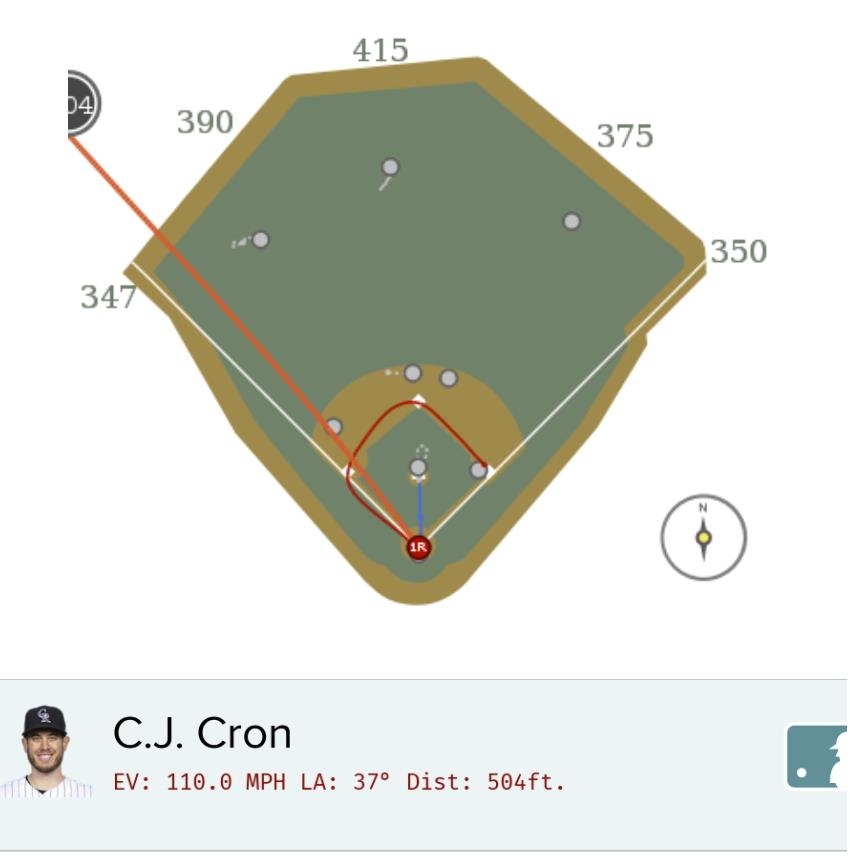 비거리는 504피트(약 153.6m). 장칼로 스탠턴(현 뉴욕 양키스)이 마이애미 말린스 시절인 2016년 쿠어스필드에서 친 홈런과 같은 거리를 비행했다.