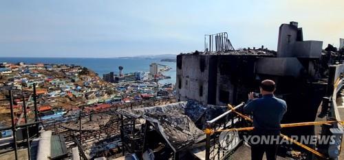 | ▲ 지난 6일 산불 피해로 폭격을 맞은 듯 참혹한 모습을 하는 강원 동해시 묵호동의 한 유명 펜션 너머로 유명관광지 논골담길과 바다, 묵호항이 보인다. [촬영 유형재] |