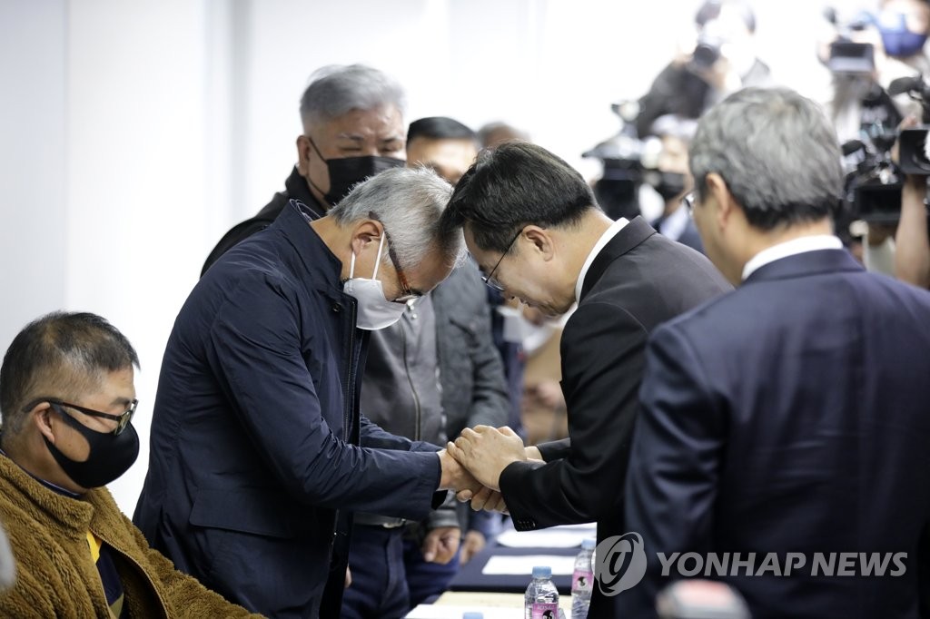 | ▲ 피해자에게 사과와 위로 전하며 (서울=연합뉴스) 2022년 10월 20일 서울 중구 진실·화해를위한과거사정리위원회에서 열린 선감학원 아동 인권침해 사건 진실규명 결정 발표 기자회견에서 김동연 경기도지사가 피해자를 위로하고 있다. 2022.10.20 [연합뉴스 자료사진. 재판매 및 DB 금지] |