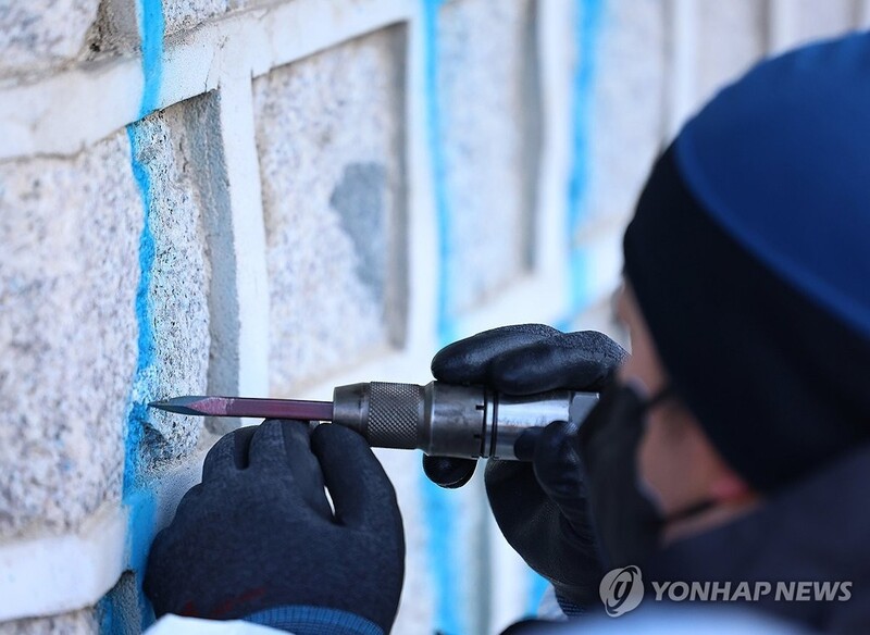 한파에 빠른 작업이 관건…'낙서' 경복궁 담장 복원에 20명 투입