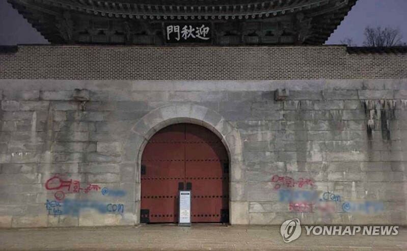 16일 종로경찰서와 문화재청에 따르면 이날 오전 1시 50분께 누군가가 경복궁 서쪽의 영추문 좌·우측, 국립고궁박물관 주변 쪽문 주변에 스프레이를 이용해 '영화공짜' 등의 문구로 낙서했다.