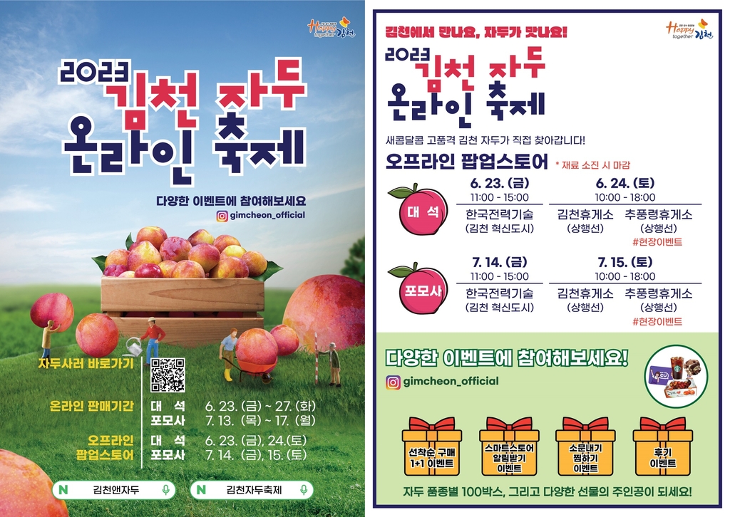 축제 기간 김천 자두를 구매하고자 하는 소비자들은 네이버 스마트 스토어 '김천앤자두'에서 구매할 수 있으며, 축제홈페이지(www.gcjadu.com)에서는 다양한 이벤트가 진행된다.