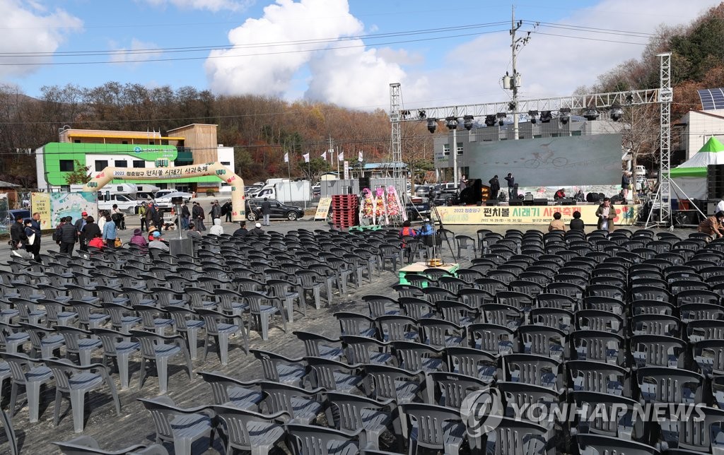 | ▲ 이태원 참사 애도하며 축제 공연 취소 (양구=연합뉴스) 양지웅 기자 = 30일 강원 양구군 해안면 펀치볼 힐링하우스 일원에서 열린 '2022 청춘양구 펀치볼 시래기 사과 축제'에서 관계자들이 공연 무대를 철거하고 있다. 축제 관계자는 "전국적인 애도 분위기 속에서 인기 가수 공연과 주민 노래자랑 등 무대 행사를 전면 취소하기로 했다"고 말했다. 정부는 이태원 참사와 관련해 내달 5일까지를 국가 애도 기간으로 정하고, 관계 부처들이 핼러윈 행사뿐만 아니라 지역 축제까지 긴급 점검해 질서 있고 안전하게 진행되도록 철저히 관리하겠다고 밝혔다. 2022.10.30 yangdoo@yna.co.kr |