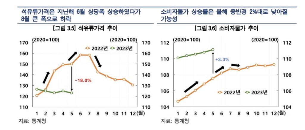 올해 물가 흐름을 좌우할 요인 가운데 국제 유가의 경우, 하반기 이후 중국경제 회복과 계절적 수요 등으로 완만한 상승 압력을 받겠지만 주요국 경기 부진 지속, 통화긴축 강화 우려 등의 하방 위험도 잠재했다는 게 한은의 분석이다.
