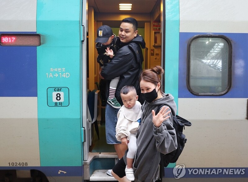 | ▲ 고향 앞으로 (서울=연합뉴스) 김도훈 기자 = 추석 연휴를 하루 앞둔 27일 서울역에서 한 가족이 고향으로 향하는 열차에 오르며 인사하고 있다. 2023.9.27 superdoo82@yna.co.kr |