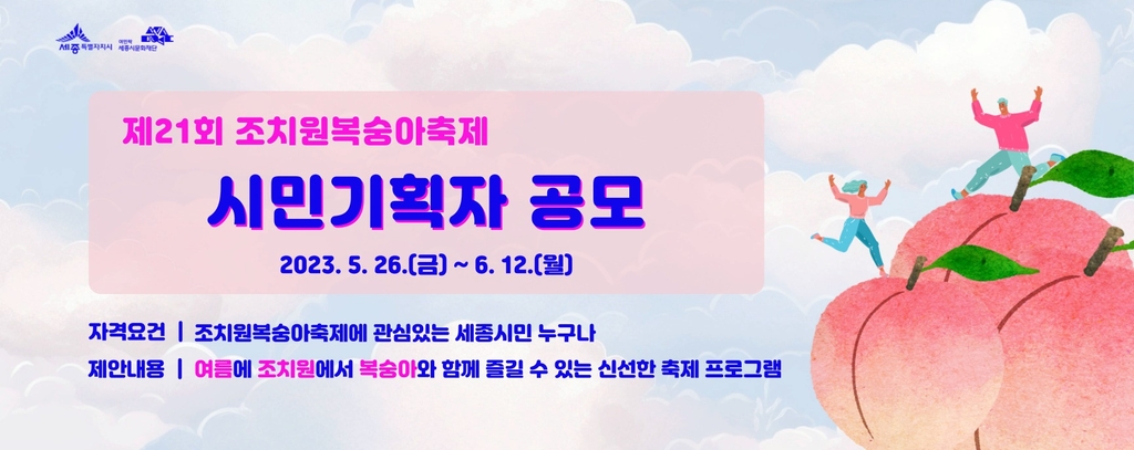 (세종=연합뉴스) 이은파 기자 = 세종시문화재단은 오는 8월 '제21회 조치원복숭아축제'에 함께할 시민 기획자를 다음 달 12일까지 공모한다고 26일 밝혔다.
