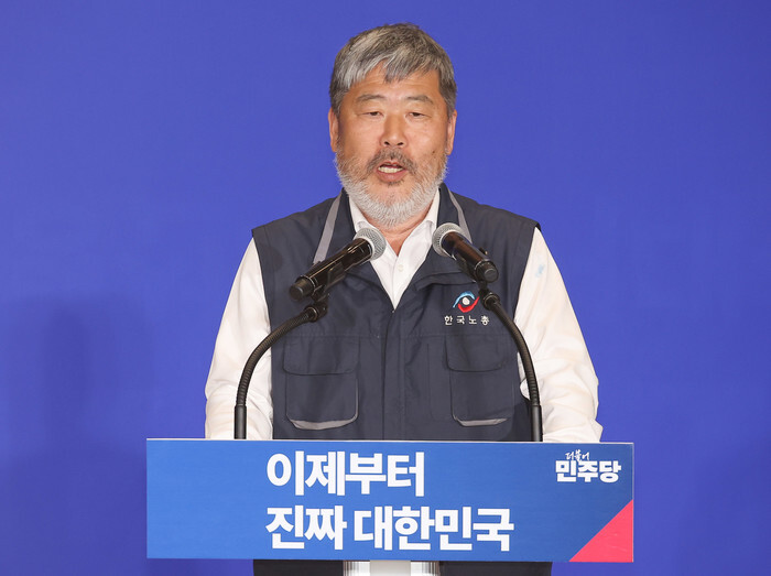 The Federation of Korean Trade Unions chief Kim Dong-myung, appointed as a co-chair of the liberal Democratic Party's (DP) election committee, speaks during a ceremony at the National Assembly in Seoul on April 30, 2025, to launch the committee that aims to woo both liberal and conservative voters ahead of the June 3 presidential election. (Yonhap)