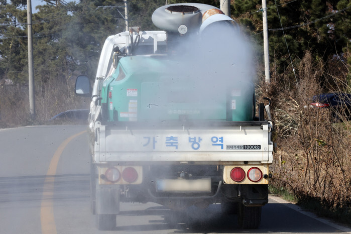 Avian flu outbreakA quarantine vehicle carries out disinfection near a duck farm in the southwestern county of Yeongam on Dec. 9, 2025, after the outbreak of avian influenza at the farm. (Yonhap)(END)