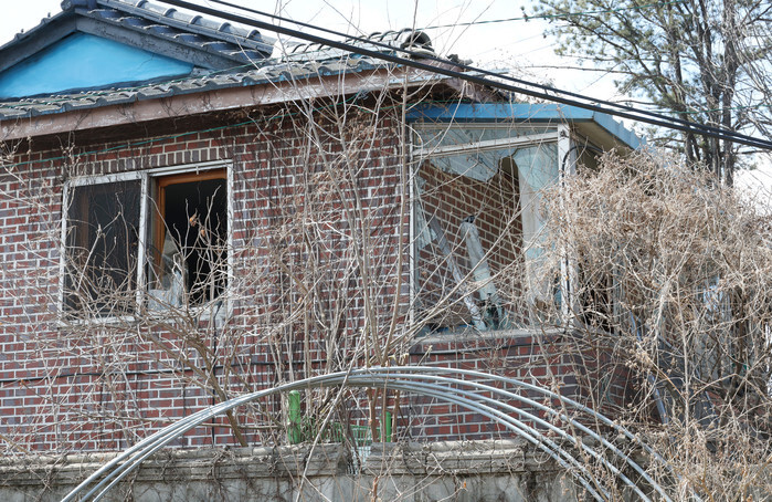 Windows of a house are broken in a village in Pocheon, some 40 kilometers north of Seoul, on March 6, 2025, where a bomb fell on a road, leaving at least seven people with minor to serious injuries, and destroying a church and six other buildings. The accident came after two Air Force KF-16 fighter jets accidentally dropped eight bombs outside a training range during live-fire drills. (Pool photo) (Yonhap)