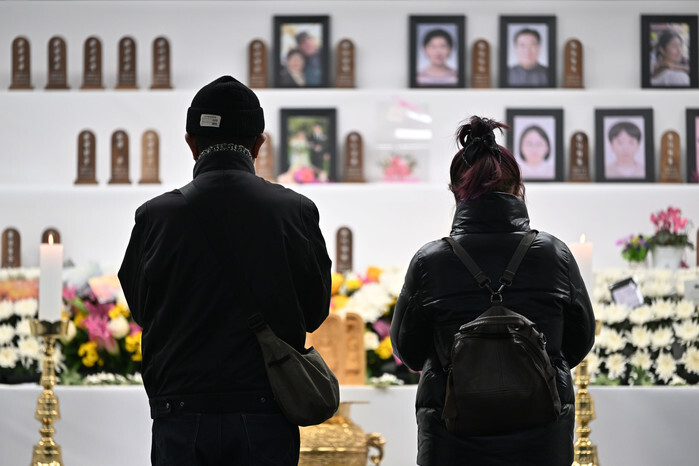 Bereaved family members of victims of the Jeju Air plane crash attend their memorial service at an airport in South Korea's southwestern city of Muan, where the accident happened about two months ago, on Feb. 15, 2025. (Pool photo) (Yonhap)