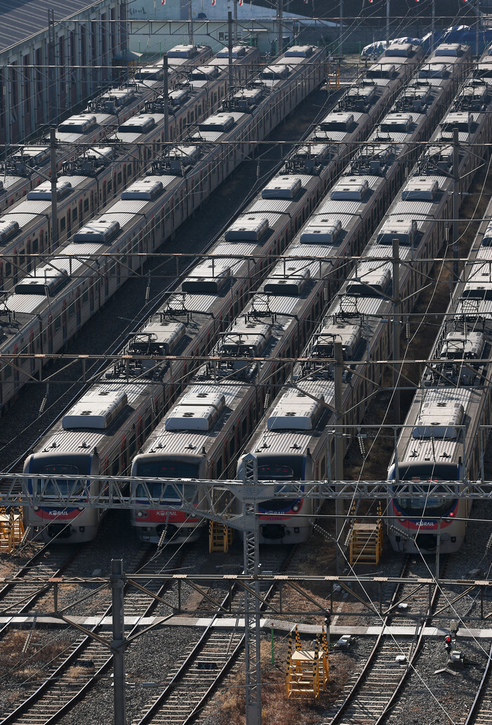 Trains are stored at a depot belonging to South Korea's train operator KORAIL in Seoul's Guro Ward on Dec. 22, 2025, a day before the Korean Railway Workers' Union launches a strike following its failure to reach a deal with the government over bonus payments. (Yonhap)