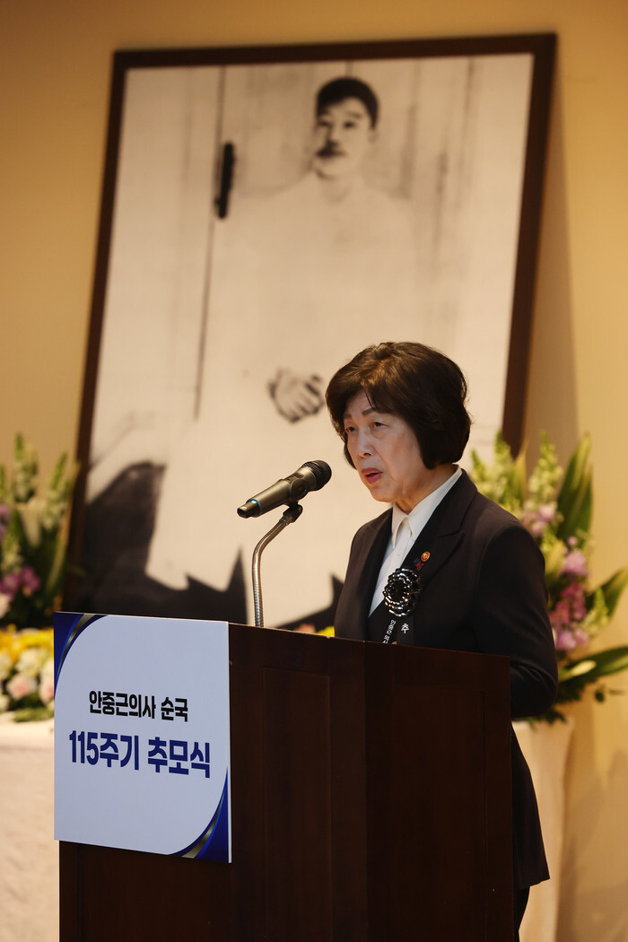 Patriots and Veterans Affairs Minister Kang Jung-ai delivers a eulogy in front of a portrait of Korean independence fighter Ahn Jung-geun during a memorial for Ahn in Seoul on March 26, 2025, to mark the 115th anniversary of his death. The independence fighter during Japanese colonial rule of Korea was executed at a prison in China by Japanese authorities after being arrested in 1909 for assassinating Ito Hirobumi, the Japanese resident-general in Korea, at a railway station in Harbin, a city in China's Heilongjiang province. (Yonhap)