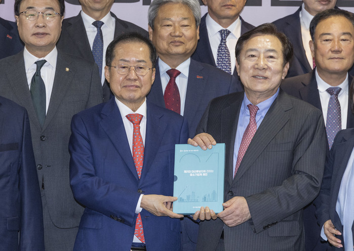 Former Daegu Mayor Hong Joon-pyo (L), a candidate in the conservative People Power Party s primary to choose its flag bearer for the June 3 presidential election, poses for a photo with Kim Ki-mun, chairman of the Korea Federation of Small and Medium Business, at the federation's headquarters in Seoul on April 28, 2025, after receiving proposal documents on small and medium businesses from Kim. (Yonhap)