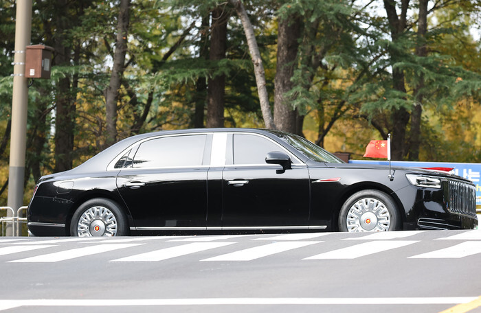 A vehicle believed to be carrying Chinese President Xi Jinping runs on a road in the southeastern city of Gyeongju on Oct. 30, 2025, as Xi arrived in South Korea earlier in the day to take part in this year's summit of the Asia-Pacific Economic Cooperation forum. (Yonhap)