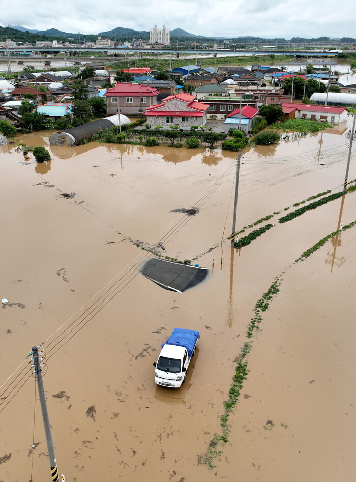 Houses are inundated in a village in Yesan, South Chungcheong Province, central South Korea, on July 17, 2025, following torrential rains that hit the region. (Yonhap)