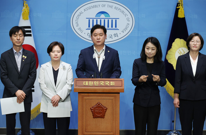 First-term lawmakers of four opposition parties hold a news conference at the National Assembly in Seoul on June 7, 2024, calling for the early creation of committees for the newly launched 22nd National Assembly. The ruling People Power Party and the main opposition Democratic Party have yet to reach a compromise over how to allocate the chairs of the committees, although the new Assembly opened May 30. (Yonhap)