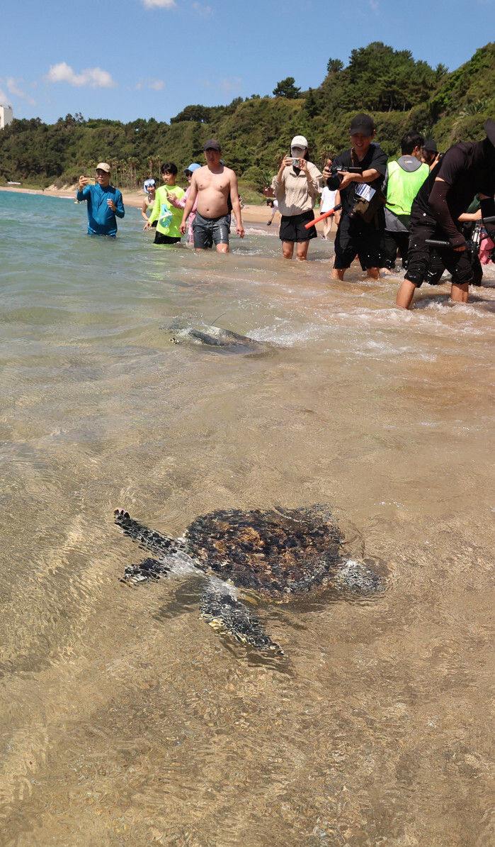 Employees of the Oceans and Fisheries Ministry release sea turtles, a species in danger of global extinction, on Saekdal Beach in the city of Seogwipo on South Korea's largest island of Jeju on Sept. 11, 2025. The ministry sent 13 sea turtles, born through artificial incubation or rescued after they were found injured, into the sea. (Yonhap)