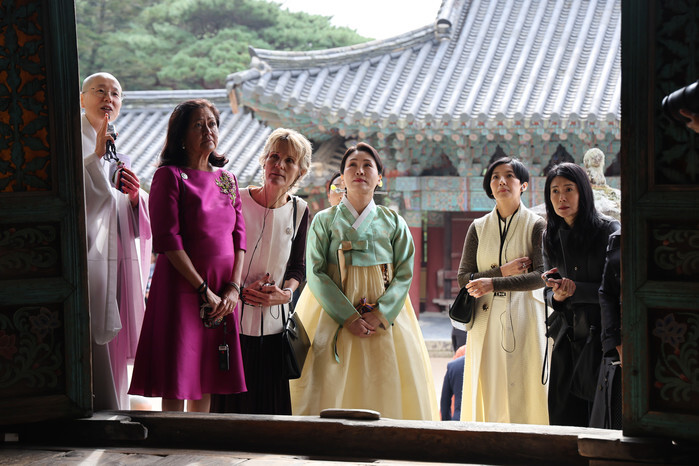 South Korean first lady Kim Hea Kyung (C) and spouses of APEC leaders visit Bulguk Temple in the southeastern South Korean city of Gyeongju on Oct. 31, 2025. (Yonhap)