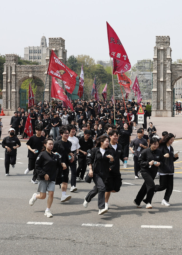 Students of Korea University run out of the school's gate in Seoul on April 18, 2025, as they take part in an 8-kilometer march to remember the late democratic fighters buried at the April 19th National Cemetery in the South Korean capital, one day before the 65th anniversary of the April 19, 1960, pro-democracy revolution. The day commemorates the students' movement against the autocratic rule of then President Rhee Syng-man after the discovery of massive election rigging in the presidential election. The uprising forced Rhee to eventually resign. (Yonhap)