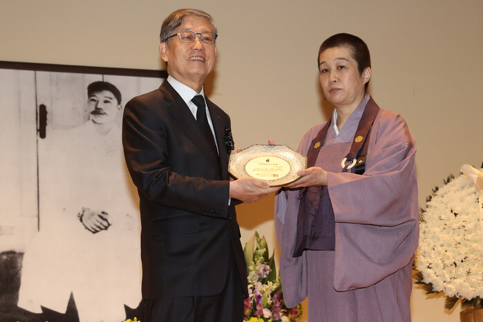 Former Prime Minister Kim Hwang-sik (L) confers the Ahn Jung-geun Oriental Peace Award on Mako Saito, chief priest of Dairinji Temple in Wakayanagi, Japan's Miyagi Prefecture, during a memorial for Korean independence fighter Ahn Jung-geun in Seoul on March 26, 2025, to mark the 115th anniversary of his death. The independence fighter during Japanese colonial rule of Korea was executed at a prison in China by Japanese authorities after being arrested in 1909 for assassinating Ito Hirobumi, the Japanese resident-general in Korea, at a railway station in Harbin, a city in China's Heilongjiang province. The Japanese temple has conducted annual memorial rites for the Korean patriot whose Oriental Peace Theory called for the three countries ― Korea, China, and Japan ― to maintain independence and achieve Eastern peace by defending themselves from the invasion of Western imperialism through mutual aid. (Yonhap)