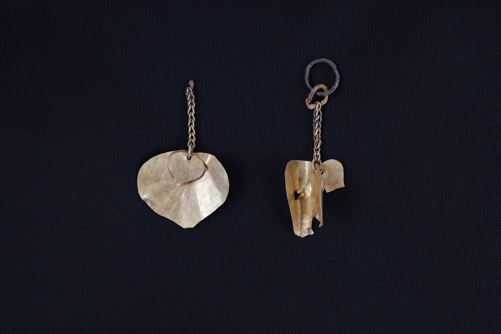 이 금귀걸이는 지난 1월 고분군 현장조사에서 발굴된 너비 4cm의 심엽형(나뭇잎·하트 모양) 금귀걸이와 한 쌍으로 확인됐으며, 고리 부분까지 온전한 형태로 출토됐다.