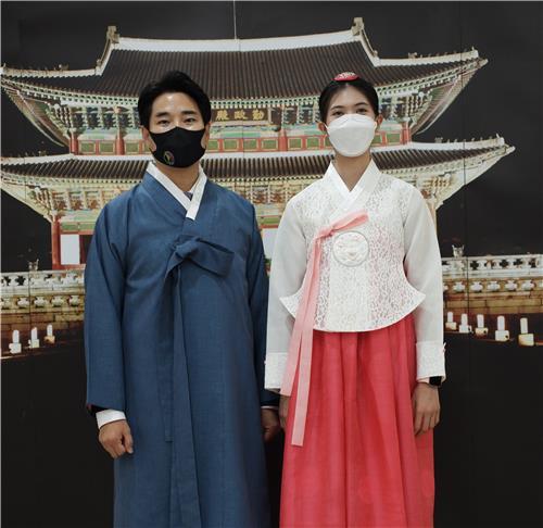 | ▲ This photo, provided by the Korean Cultural Center of Thailand, shows Choi Young-seok (L), the South Korean-born coach of the Thai taekwondo team, and Tokyo Olympics gold medalist Panipak Wongpattanakit wearing "hanbok," a traditional Korean outfit. (PHOTO NOT FOR SALE) (Yonhap) |