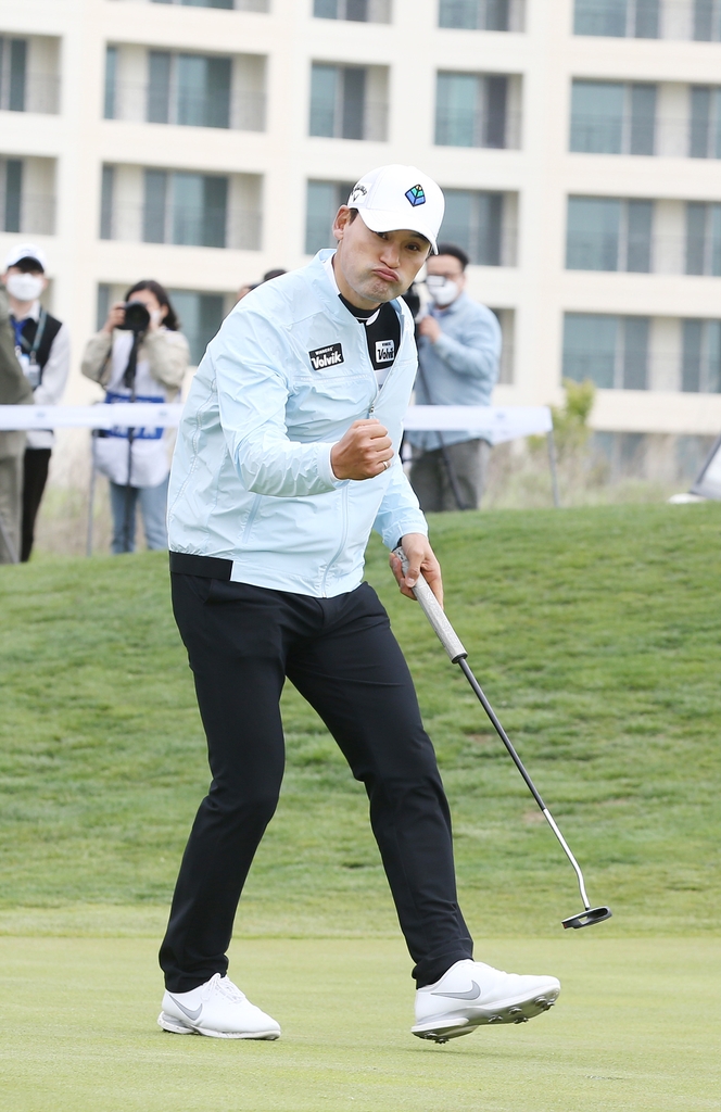 | ▲ 9번 홀 파를 지킨 뒤 기뻐하는 박찬호. [KPGA 제공. 재판매 및 DB 금지] |