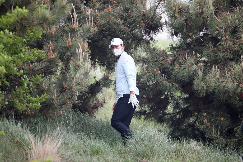 그는 9번 홀(파5)에서 티샷이 러프로 향해 공을 찾기에도 어려웠을 정도였지만 3번 우드로 친 두 번째 샷을 홀 129야드 정도로 보냈다.