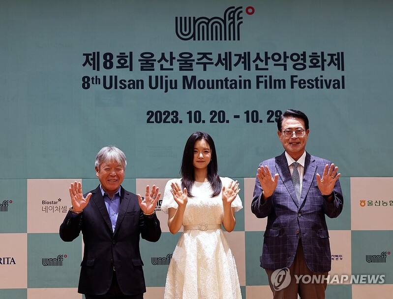 | ▲ '올 가을 울주에서 산악영화 즐겨요' (울산=연합뉴스) 장지현 기자 = 25일 오전 울산시청 시민홀에서 열린 제8회 울산울주세계산악영화제 기자회견에서 참석자들이 기념사진을 찍고 있다. 사진은 왼쪽부터 차례로 엄홍길 집행위원장, 홍보대사 고보결, 이순걸 이사장. 2023.9.25 jjang23@yna.co.kr |