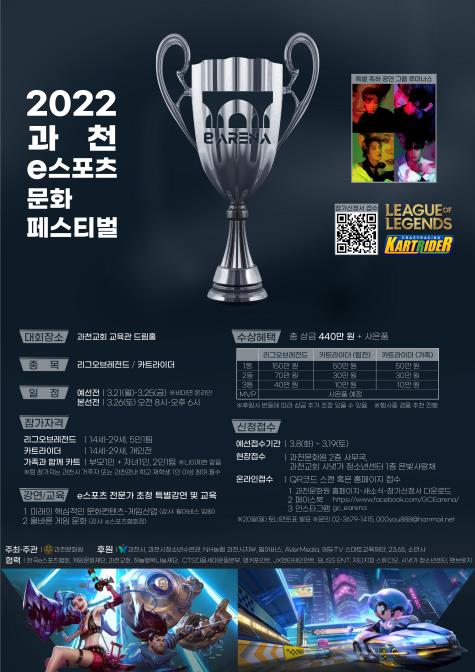 참여 신청은 이날부터 19일까지 과천문화원과 과천교회 시냇가 청소년센터를 방문해 접수하거나 페이스북 또는 인스타그램의 '과천 e스포츠 문화페스티벌' 계정을 통해 온라인으로 할 수 있다.