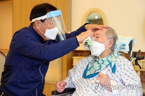 | ▲ A man wipes away his wife's tears at a nursing home in Gwangju, Gyeonggi Province, on Sept. 20, 2021. The couple met in person for the first time in two months as the government has enforced special quarantine steps for the Chuseok holiday amid the new coronavirus, in this photo provided by the health ministry. (PHOTO NOT FOR SALE) (Yonhap) |