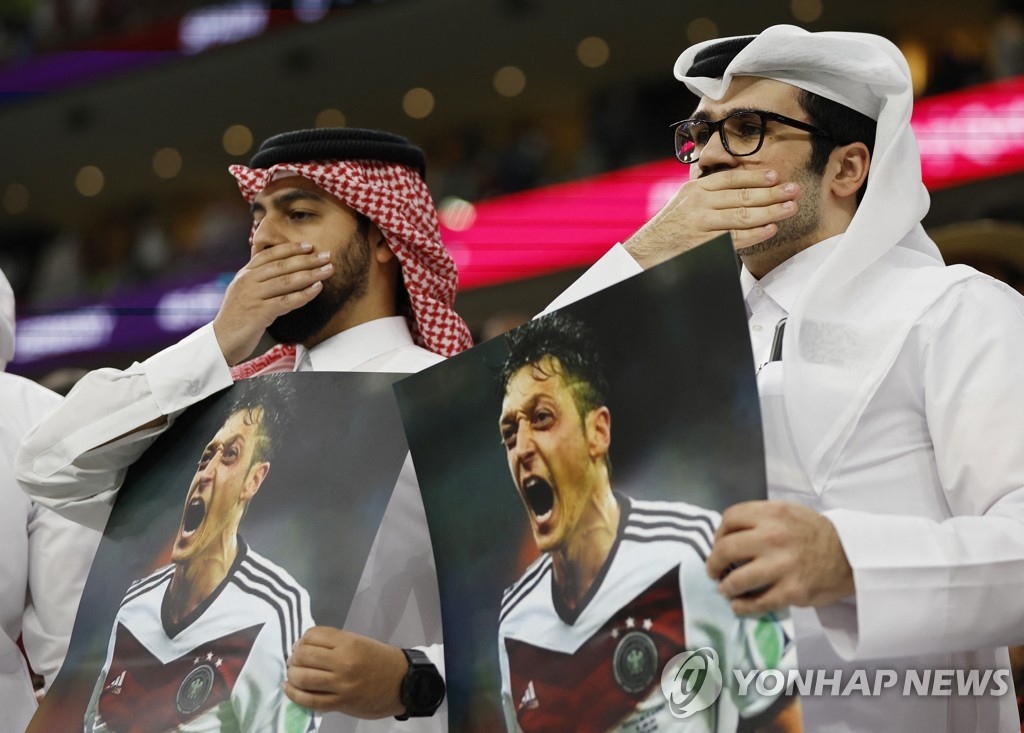 28일 카타르 월드컵 조별리그 E조 스페인과 독일의 경기가 펼쳐진 알코르의 알바이트 스타디움에서는 일부 카타르 팬들이 꺼내든 외질의 얼굴 그림, 사진이 관중석을 채웠다.