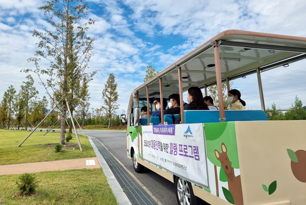 | ▲ 전기버스 탑승해 해설 프로그램 듣는 코로나19 대응 업무 종사자 [국립세종수목원 제공. 재판매 및 DB 금지] |