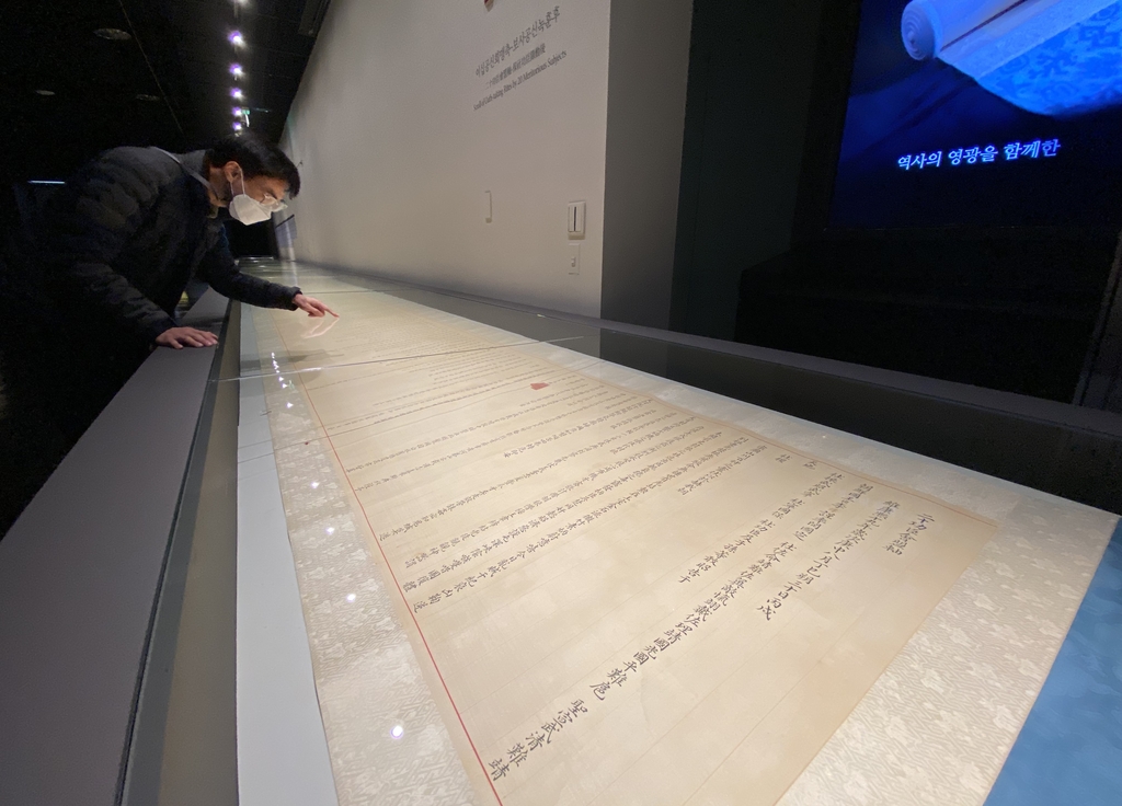 (성남=연합뉴스) 박상현 기자 = 길이 20m가 넘는 고운 직물에 가지런히 쓴 글씨를 보니 감탄사가 절로 나온다. 정성 들여 만든 장식도 화려하기 그지없다.