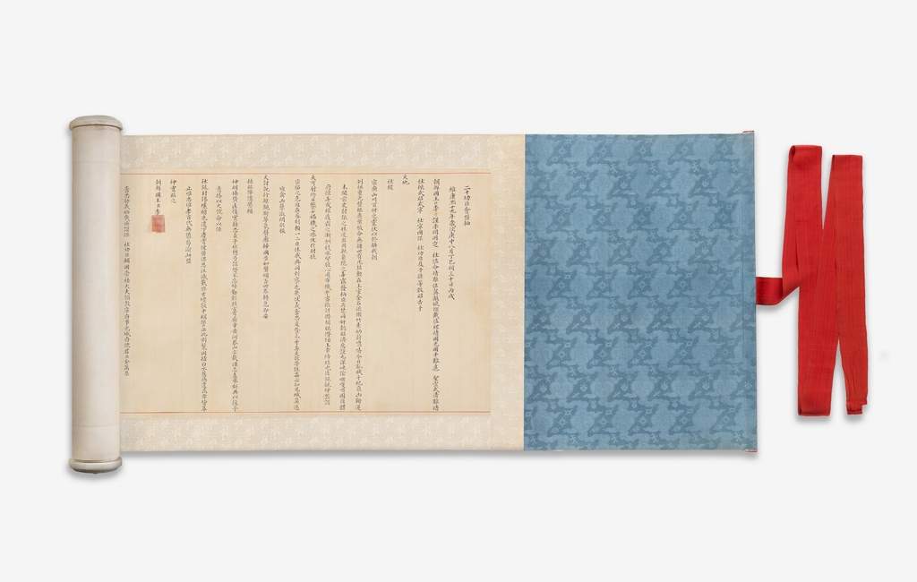 지난 2월 보물에서 국보로 승격된 '이십공신회맹축-보사공신녹훈후'다. 조선 숙종 20년인 1694년 임금에게 충성을 맹세하던 의식인 회맹제(會盟祭)를 치르고 공신과 후손 489명 명단을 적은 문서로, 역사학과 미술사학 측면에서 매우 의미 있는 유물로 평가된다.