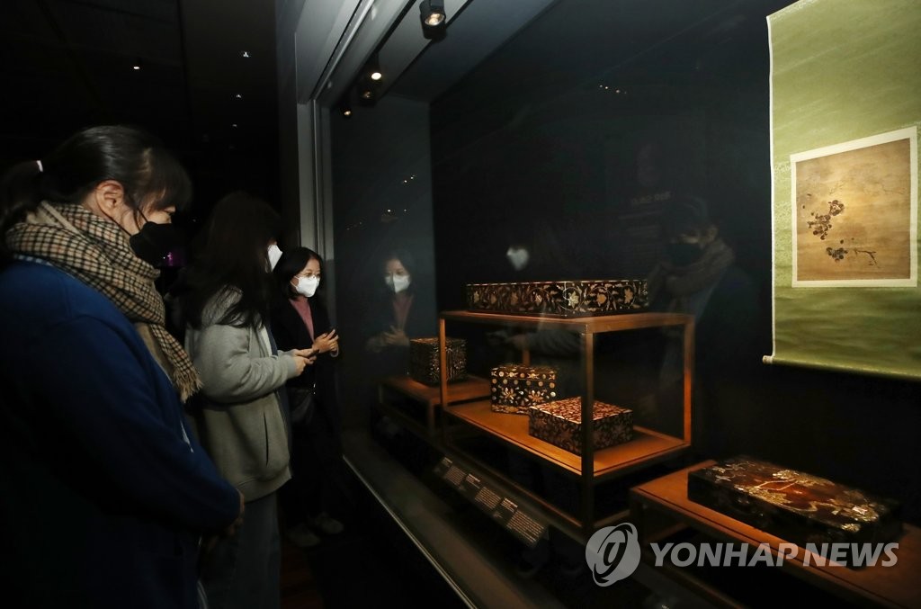 ▲ 우리나라 나전칠기의 대표작들 (서울=연합뉴스) 진연수 기자 = 20일 서울 용산구 국립중앙박물관에서 열린 특별전 '漆(칠), 아시아를 칠하다' 언론공개회에서 참석자들이 작품을 관람하고 있다.