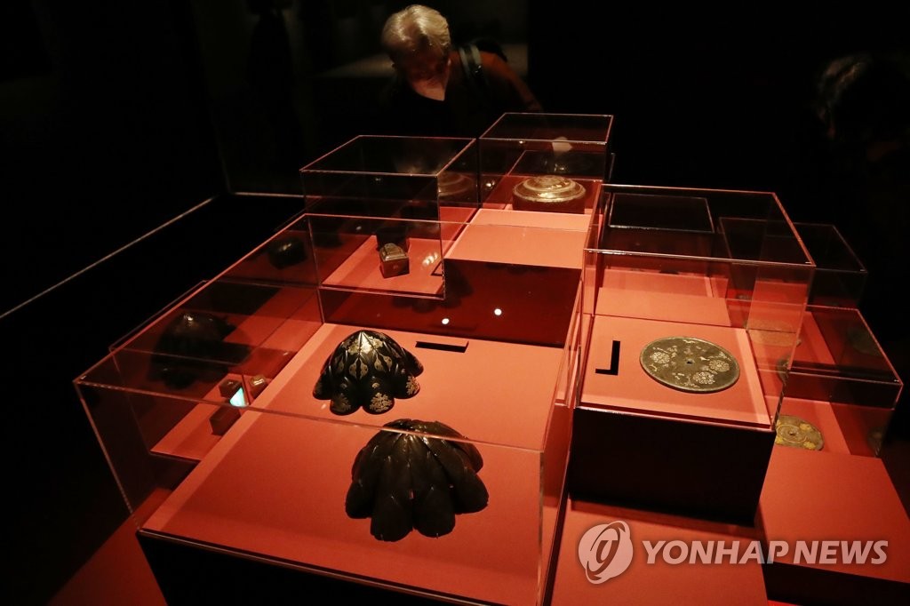 ▲ '칠기를 꾸미다' (서울=연합뉴스) 진연수 기자 = 20일 서울 용산구 국립중앙박물관에서 열린 특별전 '漆(칠), 아시아를 칠하다' 언론공개회에서 참석자들이 꽃과 동물무늬를 붙인 거울과 공예품들을 살펴보고 있다.