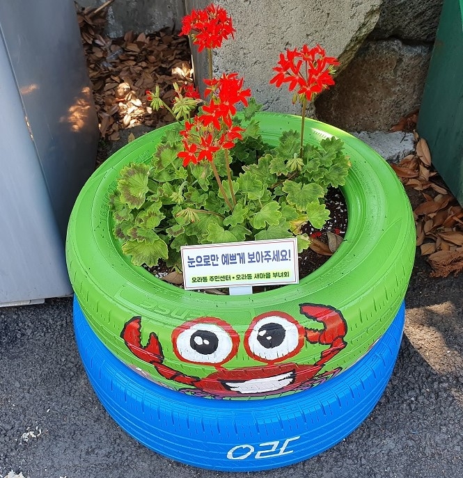 | ▲ 폐타이어를 활용해 만든 화분 [제주시 오라동주민센터 제공. 재판매 및 DB 금지] |