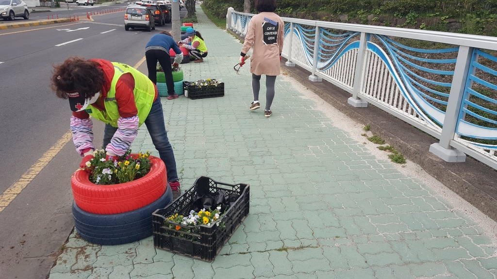 | ▲ 제주시 오라동지역 도로변에 설치된 폐타이어에 꽃을 심는 봉사자들 [제주시 오라동주민센터 제공. 재판매 및 DB 금지] |