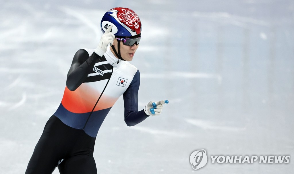 | ▲  Lee June-seo of South Korea reacts after the semifinals of the men's 1,000m short track speed skating event at the Beijing Winter Olympics at Capital Indoor Stadium in Beijing on Feb. 7, 2022. (Yonhap) |