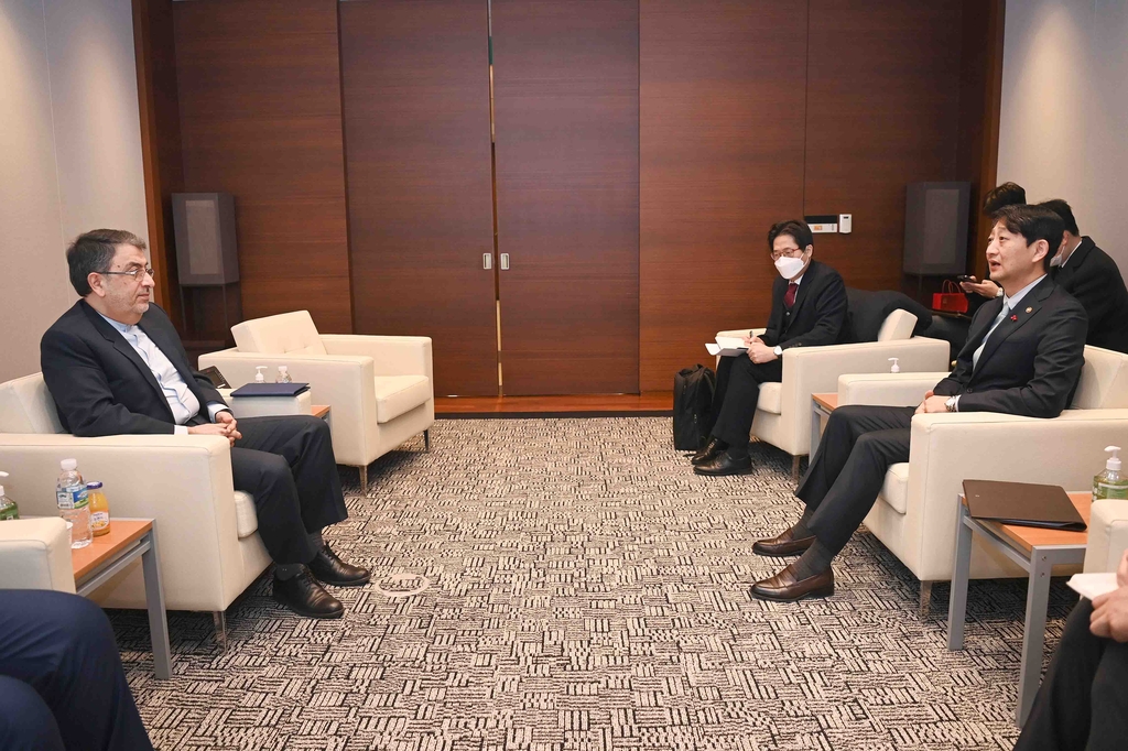 | ▲ This photo, provided by South Korea's trade ministry shows Minister Ahn Duk-geun (R) speaking with Iran's Ambassador to South Korea Saeed Shabestari (L) in Seoul on Jan. 5, 2023. (PHOTO NOT FOR SALE) (Yonhap) |