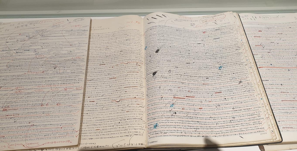 | ▲ 객주문학관에 전시된 김주영 작가의 노트 (청송=연합뉴스) 이은정 기자 = 폐교를 증·개축한 객주문학관에 전시된 깨알 같은 글씨가 담긴 김주영 작가의 노트 |