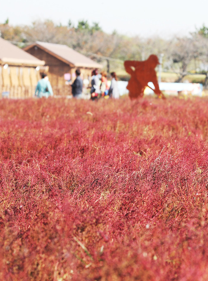 Visitors walk through a crimson field of East Asian seepweed, which grows on tidal wetlands, at an ecological park in Siheung near Seoul on Oct. 22, 2021. (Yonhap)