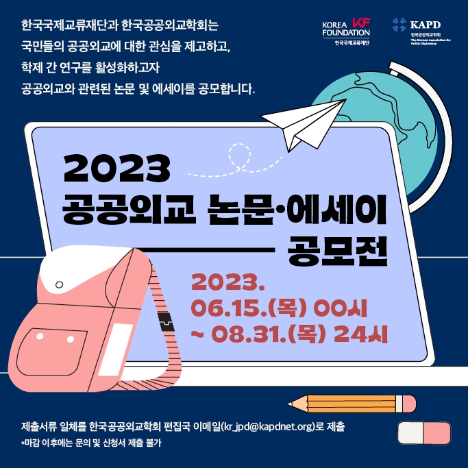 공모 안내 및 제출 양식 등 공모전 관련 자세한 사항은 KF 홈페이지(www.kf.or.kr)와 한국공공외교학회 홈페이지(www.kapdnet.org)에서 확인할 수 있다.