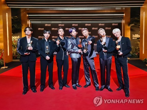 | ▲ K-pop boy band BTS poses for a photo in Seoul on May 24, 2021, as they take part virtually in the ceremony of the 2021 Billboard Music Awards, in this file photo captured from the group's official Twitter account. (PHOTO NOT FOR SALE) (Yonhap) |